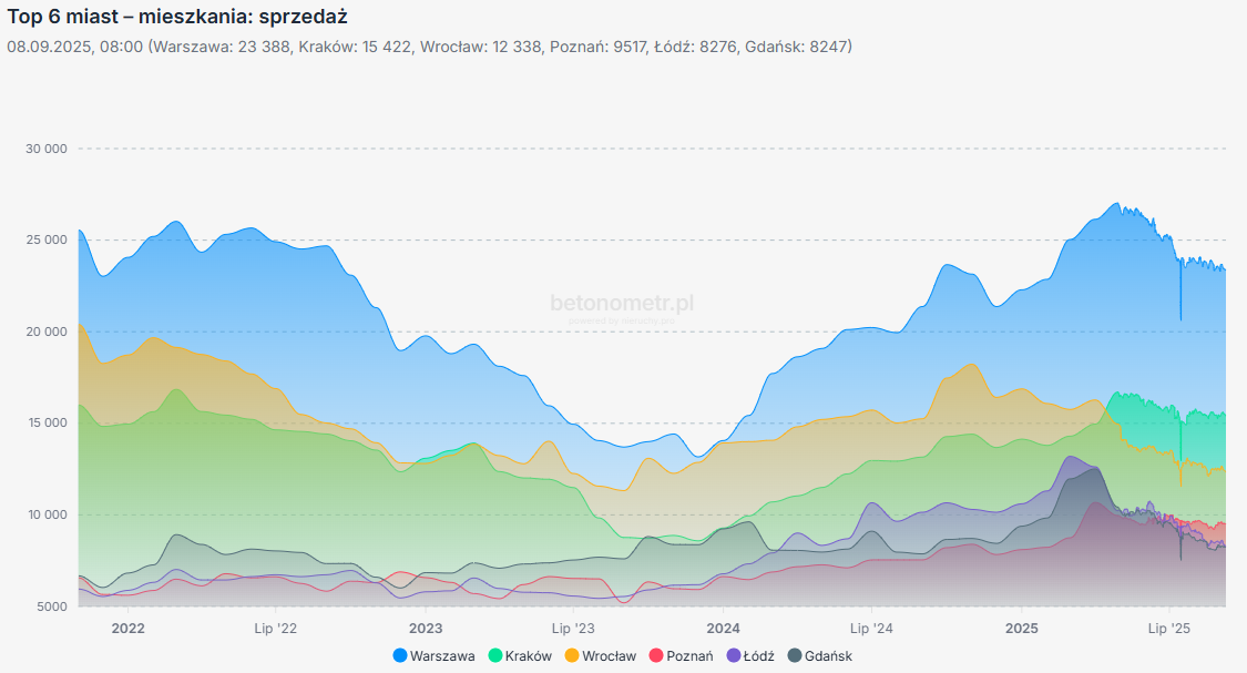 Na dzień 01.09.2025 liczba dostępnych mieszkań w sześciu największych aglomeracjach wyniosła 77.893 szt. co jest jednym z najwyższych poziomów w historii (wykres).