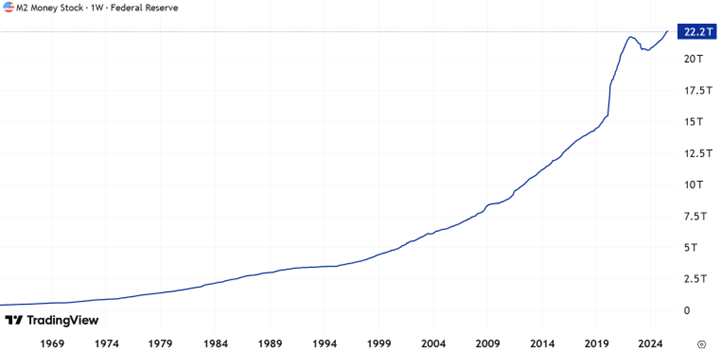 Dlaczego to istotne? Ponieważ system oparty o rezerwy złota wymuszał dyscyplinę fiskalną. Rząd mógł emitować dolary tylko w ilościach proporcjonalnych do posiadanego złota, a wydatki rządowe mogły wynikać tylko z realnych dochodów Państwa. Gdy zniknął hamulec bezpieczeństwa, można było już wciskać gaz do oporu. Banki centralne zwiększały podaż waluty według własnego uznania, nie patrząc na konsekwencje. W ten sposób ilość pieniędzy w obiegu zaczęła rosnąć, co pokazuje wykres podaży waluty M2 w USA.