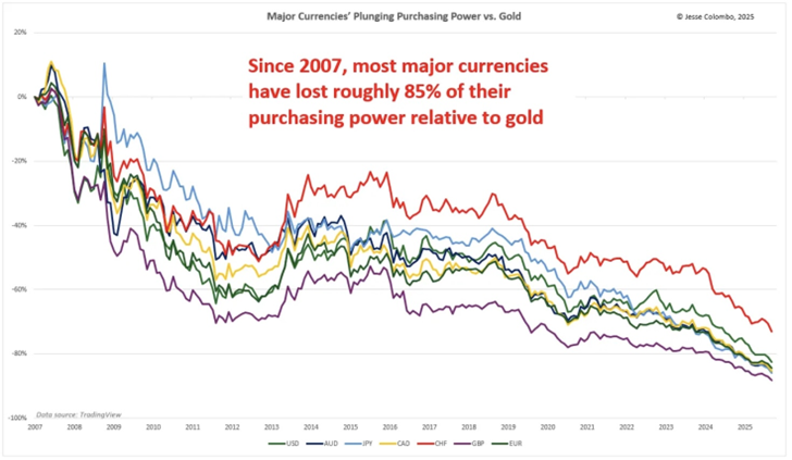 Widzimy więc, że inflacja, czyli spadek siły nabywczej pieniądza, jest naturalnym skutkiem tego systemu. Nie da się od niej uciec. Od 2007 roku niemal każda waluta straciła około 85% względem złotego kruszcu (wykres).