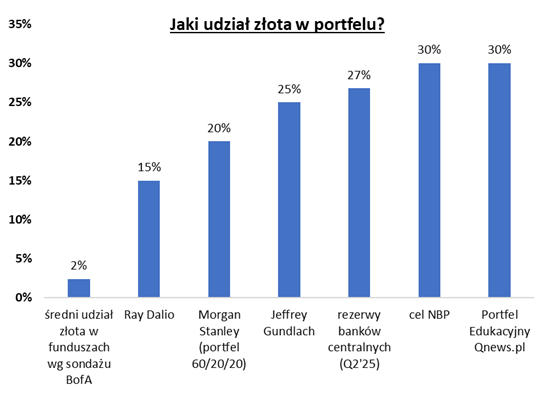 We wrześniu strateg banku Morgan Stanley M. Wilson zaproponował porzucenie tradycyjnej formuły 60/40 (60% akcji + 40% obligacji) i zastąpienie jej formułą 60/20/20, w której 20% portfela to złoto. Znany inwestor Ray Dalio zalecił wagę na poziomie 15%.