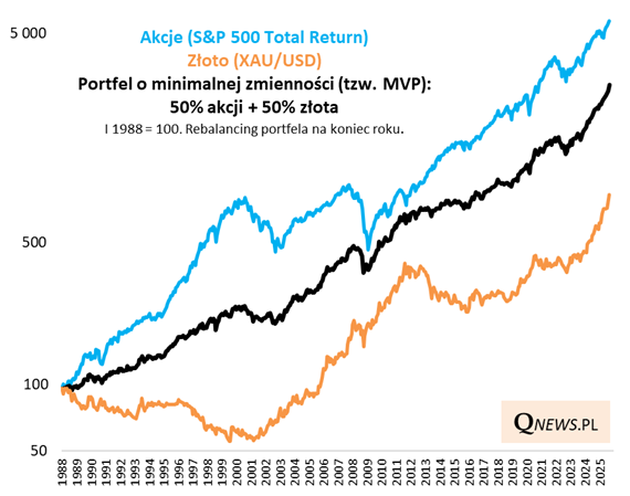 W marcu 2024 – gdy cena metalu dopiero wybijała się górą z kilkuletniej konsolidacji – dokładnie przeanalizowaliśmy historyczne relacje między notowaniami złota i amerykańskich akcji. Ku naszemu zaskoczeniu obliczenia pokazały, że na przestrzeni ostatnich dekad uzasadnione byłoby posiadanie dużo większej porcji szlachetnego metalu, niż wynikałoby to z mainstreamowego podejścia – dodanie aż 50% złota do S&P 500 pozwoliłoby na zminimalizowanie ryzyka (zmienności) całego portfela (oczywiście kosztem stopy zwrotu, ale ta obniżyła się w dużo mniejszym stopniu niż zmienność).