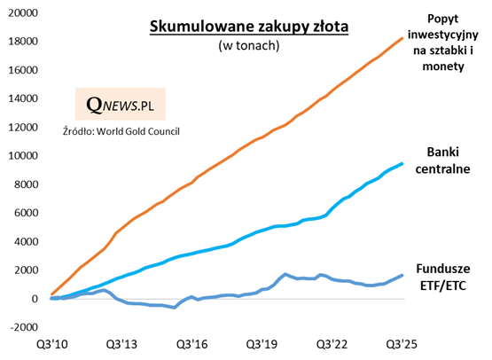 Co prawda zakupy funduszy w III kwartale nie były rekordowe, jeśli chodzi o wolumen (w tonach), ale prawdopodobnie osiągnęły rekord w ujęciu wartościowym (ok. 24 mld dolarów popytu). Popyt ze strony funduszy to zatem główny motor ostatniej fali hossy na rynku złota, ale pamiętajmy też, że na długą metę jest to najbardziej chwiejna i niestabilna kategoria.